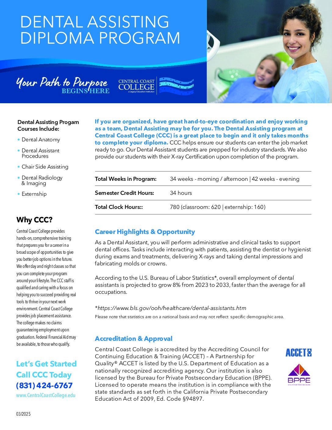 The Dental Assisting program is a great way to enter the healthcare industry. At Central Coast College, we offer hybrid, hands-on and online courses. You can get the training you need in as little as 34 weeks!